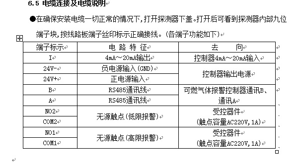 本产品为防爆产品,适用于石油、化工、储气站、生产车间等可能存在可燃性或有毒有害气体泄漏或爆炸危险环境的Ⅰ区和Ⅱ区,不适用于0区及煤矿井下环境。探测器对于可燃气体泄露事故可进行安全检测和预先报警。探测器具有四位LED显示、红外遥控、三线制4mA~20mA输出、RS485总线通信(Modbus RTU协议)和无源触点输出功能。探测器根据其输出特性分为无源触点型、4mA~20mA多线型、RS485总线型,用户根据对应输出方式对设备进行开通调试